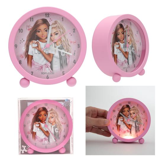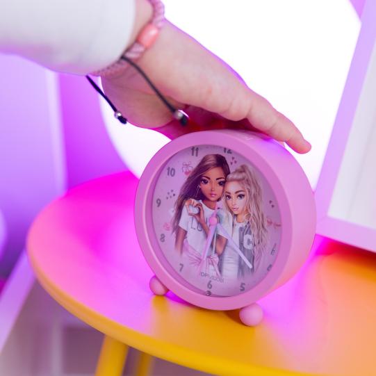 Este despertador redondito en rosa chicle es lo más. Tiene a dos modelos TOPModel súper guapas rodeadas de iconos que te van a encantar: corazones, estrellitas, lazos... ¡Todo súper cute! ¿Y sabes qué más? No hace ni un ruidito mientras duermes (shhh...) ¿Está oscuro? ¡Pulsa el botoncito y se enciende la luz! Y cuando llega la hora… ¡suena la alarma y empieza la aventura! Con sus patitas redondas, parece un reloj sacado de un cuento. ¡Ponlo en tu mesita y despiértate con alegría y estilo TOPModel cada mañana!