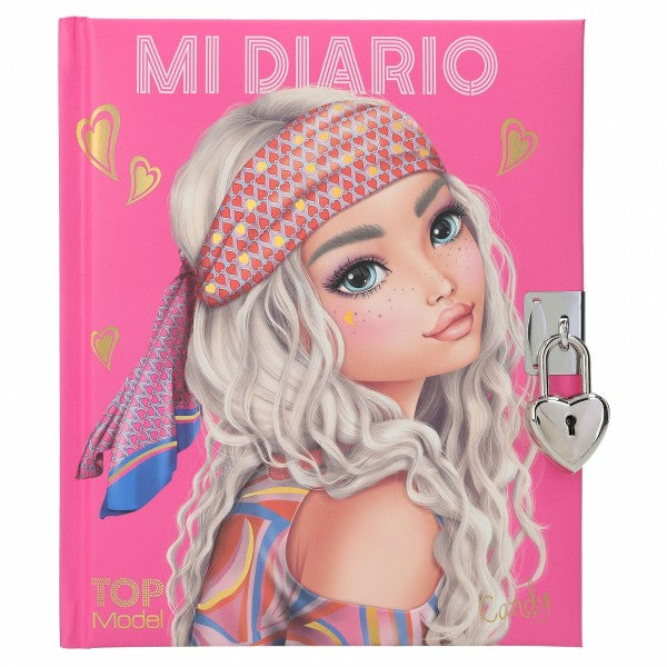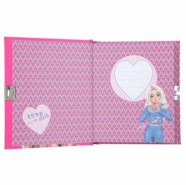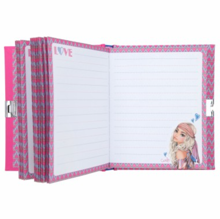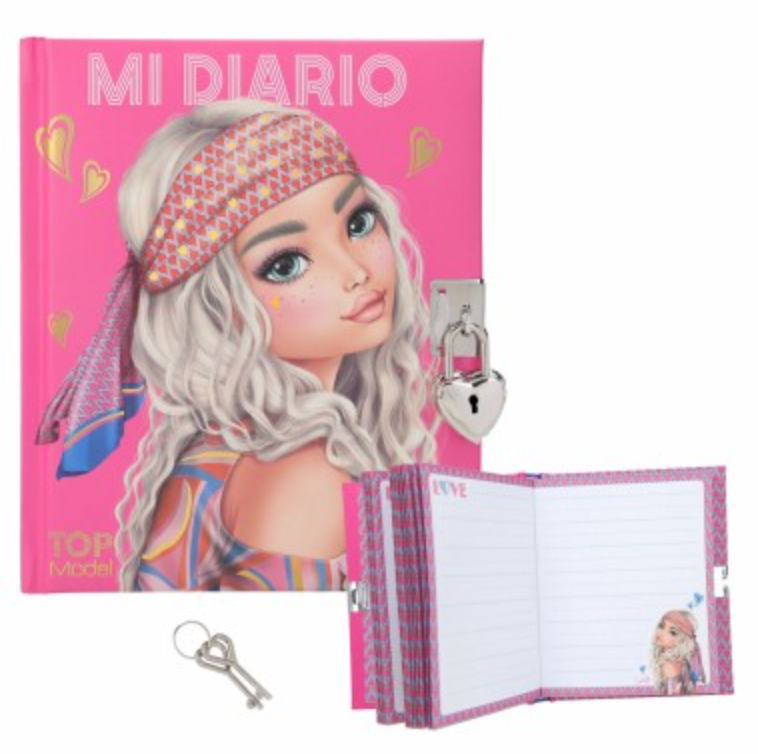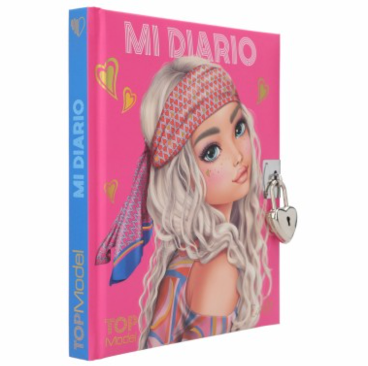 Los secretos se sentirán aquí muy a gusto, guardados por las modelos de TOPModel. El diario, con candado en forma de corazón, tiene páginas con pauta de líneas e ilustraciones a todo color. Con diseño rosa fucsia que recrea el look hippie de los años 70.