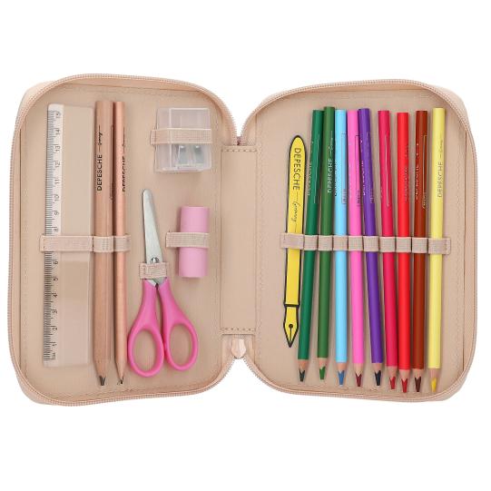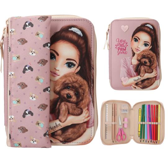 Este estuche color malva destaca por la ilustración a gran tamaño de una modelo acompañada de un adorable perrito en la cara delantera y como toque especial incluye un estuche pongotodo pequeño con estampado de perritos que se fija con velcro lo que permite ponerlo y quitarlo fácilmente según necesites, completamente equipado con 9 lápices finos de colores tijeras goma de borrar sacapuntas doble y regla además cuenta con un práctico elástico libre para sujetar un bolígrafo o pluma adicional!! Garantiza resistencia ligereza y comodidad para el uso diario con un diseño que combina ternura y funcionalidad en cada detalle