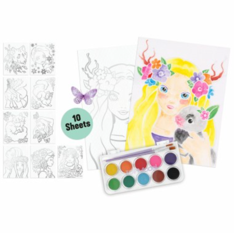Un fantástico set de acuarelas!!! Es divino por un lado laminas para colorear con efecto aguas plastificadas, para iniciarte en el increíble mundo de la pintura, un estuche de acuarelas con diez colores maravillosos también puedes mezclarlos para hacer colores nuevos… te atreves?