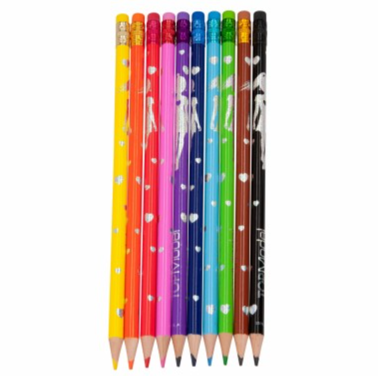 ¡Cuánto colorido! ¡Con estos diez lápices de colores no cuesta dibujar modelos de TOPModel, diseños chulos y dibujos fantásticos! Y lo mejor es que es muy sencillo borrar si te equivocas porque llevan una goma en el extremo. ¡Qué guay! Colores: amarillo, naranja, rojo, rosa, lila, azul oscuro, azul claro, verde, marrón, negro.