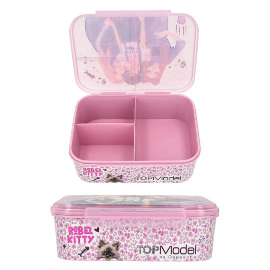 Fantástico!! Con tres separadores en su interior, este táper decorado con el estampado de moda animal print, en la tapa tres súper modelos de TOPModel, lucen prendas de lo más atrevidas ..Y a ti también te encanta esta colección felina REBEL KITTY ¿?